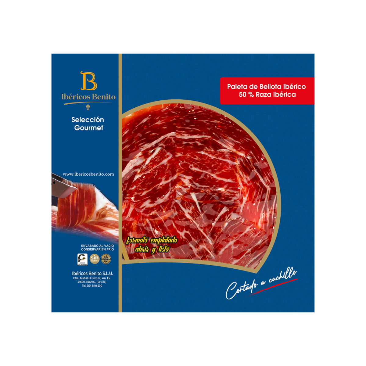 Si buscas comprar paleta de bellota 50% ibérico cortada a cuchillo, esta presentación en blonda redonda es la elección perfecta para deleitarse, compartir o regalar. Disfruta del auténtico sabor del ibérico en cada loncha y lleva a tu mesa un producto que combina excelencia, tradición y calidad.
